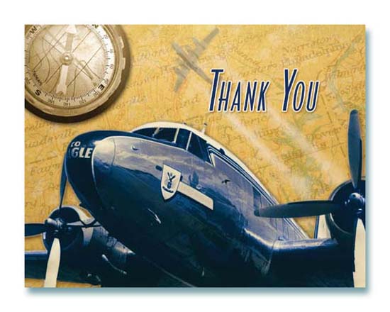 Folded Card Size: 4.25" x 5.5" (Includes 13 A2 size envelopes) Stock: Printed on heavy, 10 pt. cover stock Vivid, full-color on front. Blank on the inside. Retro DC-3 thank you card shows a touch of class with one of the most beloved aircraft of all time. |