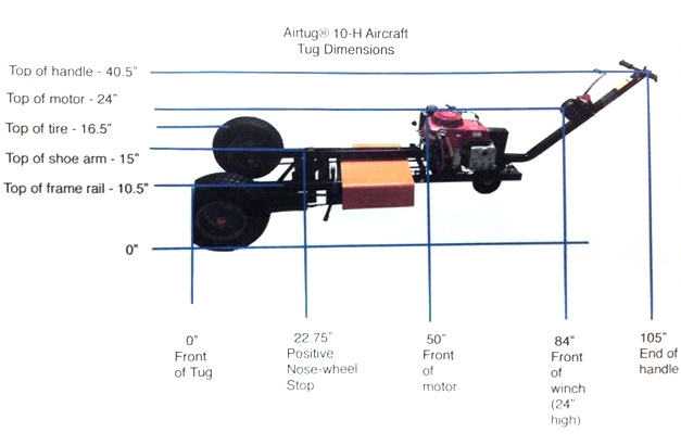 The 10-H model AirTug® is the tug of choice for those who need to lower the tail to enter a hangar or are working with a lip 3/4″ or greater. The nose-wheel is loaded onto a platform which can then be raised by a hydraulic jack up as much as needed to a maximum of roughly 7”, thus lowering the tail by approximately double this amount. Additionally, it is easy to use because of its’ unique “Twist Grip Control” system utilizing a hydrostatic transmission, electric start and a heavy duty variable speed gasoline engine. Their ensure your safety with their “Return to Brake” feature that prevents any unintentional movement of the plane when the twist grip is released. There is no metal to metal contact, no gears to shift and no jerky clutching systems to quickly wear out. Finally, its’ pinpoint handling allows the operator to pivot as tight as desired as a result of the differential transmission. All of these features simply make this aircraft tug the best in the industry! |