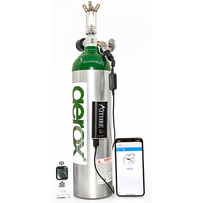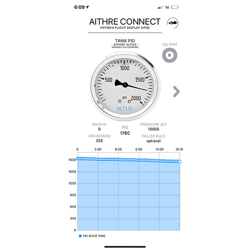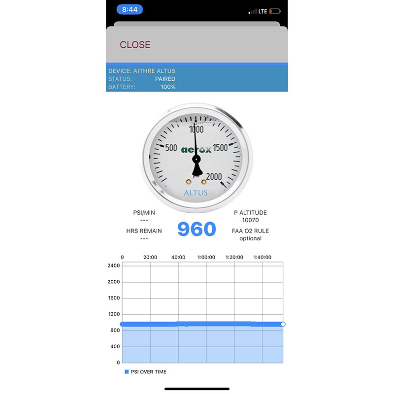 The Altus Meso is the second generation Altus smart tank monitor from Aithre with all the same innovative functionality now packaged in a miniature form factor. Altus Meso wirelessly pairs to your iOS device and Apple Watch to display pressure, flow rate, and time remaining, including oxygen trend graphing and much more, now using only USB power (optional 5V hardwired experimental aircraft installed version available upon request). This small device makes your portable oxygen tank more usable and accessible without the expense and hassle of a traditional built-in system.