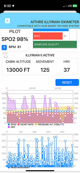 Once the haptic thresholds and parameters are set in the Aithre Connect iOS app, the Illyrian II operates to monitor and provide alerts completely independently of the app, with the exception of carbon monoxide, cabin temperature, and other miscellaneous alerts. The Illyrian II will alert with a haptic vibration when the threshold is triggered, with a pattern that is easily recognizable based on the principle of more haptics for more trouble. Supplementing the Illyrian II is the same Aithre Connect iOS app that works with our suite of oxygen system technology and hypoxia management tools. The app is optional for most of the functions of the Illyrian II as the haptic vibrations work independently once setup; however, the app provides enhancements and is required for CO and cabin temperature haptic vibrations. Having the Aithre Connect app open, enables the additional warnings of CO and cabin temperature to be passed using your existing installed or portable Shield CO detectors, which are sold separately. The Illyrian II also provides additional feedback via the iOS Aithre Connect app. This includes use of the features enjoyed with the Illyrian I, such as SPO2 and heart rate graphing, but also includes Heart Rate Variability (HRV) and trends in head movement. For customers with the Aithre Healthview and/or Shield EX 3.0, the Illyrian II will show up as a station pulse oximeter. This means up to 6 Illyrian II can be used in conjunction with the Aithre Healthview for output of multi-station blood oxygen and heart rate information to monitor the safety of you and your passengers. Additionally, the Illyrian II SPO2 information can be fed directly to your Garmin G3X, Dynon Skyview, and Advanced Flight Systems via the Shield EX 3.0. The Illyrian II is also usable for biometric feedback purposes of using the Healthview or iOS Aithre Connect app to assist the Avi smart oxygen systems. Note that some advanced and melt-Illyrian functions require use of the Aithre Connect iOS app. The Illyrian II requires active use of the Aithre Connect app for carbon monoxide, cabin temperature, or other alerts. The Aithre Connect app acts as a data bridge between any Aithre Shield carbon monoxide detector and the Illyrian II to receive carbon monoxide and temperature information. When the Aithre Connect app is run in either foreground or background with full app permissions enabled, the Illyrian II will alert for user defined thresholds of carbon monoxide and cabin temperatures. Power is via an exposed USB micro port. There is no internal battery, power levels, or on-off button to manage, greatly simplifying operation, reducing the weight and size of the Illyrian II, and minimizing the risk of inadvertent loss of power. Merely plug the in the Illyrian II to portable or dedicated USB power and the Illyrian II continuously operates for hours and hours at just around 10mA of current. The silicone pad is a complete redesign of our original pad form. It is defined by a flat tapered wing shape with a honeycomb surface pattern. These improvements make the Illyrian II more comfortable to wear over long flights and less prone to shifting during head talking and movement. The Illyrian II pad remains designed for either headband or under the ear cup placement and the Aithre Connect iOS app is usable to find the perfect pad placement location for your body. The Illyrian II is based on the same oximeter technology as the Illyrian I, which was given a prestigious Annual Editor's Choice award by Aviation Consumer magazine for 2018. The Illyrian II smart oximeter is usable to provide constant, always-on pulse oximeter readings to your iOS device and Apple Watch. SPO2 readings are obtained using a thin sensor pad worn near the ear or on the forehead and then broadcast wirelessly to your Apple phone, tablet, and watch using the Aithre Connect app. Additionally, your SPO2 readings are output via your experimental avionics when using the companion product Shield EX 3.0 or the Healthview. Additionally, the Illyrian II features continuous heart rate variability and heart beat monitoring, with continuous output and trend plotting for some key variables. With this technology, you can visualize how your heart rate and HRV change with altitude and blood oxygenation during different phases of flight. Use up to 6 Illyrian II are usable simultaneously on the iOS Aithre Connect app and Aithre Healthview to monitor you and your passenger SPO2 and BPM data throughout a flight. Each station is monitored separately with independent plots of blood oxygen and heart rate information per passenger. The Illyrian II works with the AVI smart oxygen systems to automatically turn on pulsed oxygen with low blood oxygenation readings, when used with the Aithre Connect iOS app. Additionally, the Illyrian unlocks the in-app option for lower than standard titrated oxygen for all altitudes. |