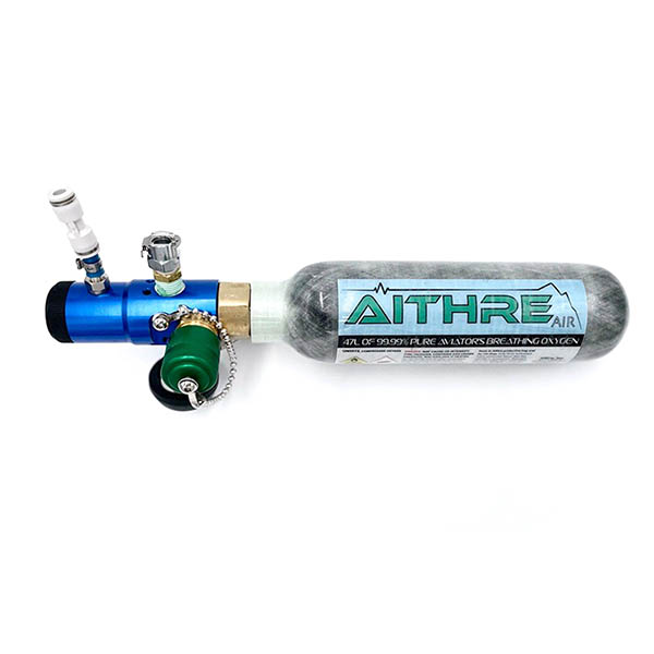 The Aithre personal oxygen bottle is constructed from lightweight composite carbon fiber with an aluminum lining and is designed for private aviation. Offering a 2000 PSI working pressure, simple on-off gauge, and an adjustable flow regulator, this bottle is ideal for pilots in private GA aircraft with flow rates as high as 25LPM.