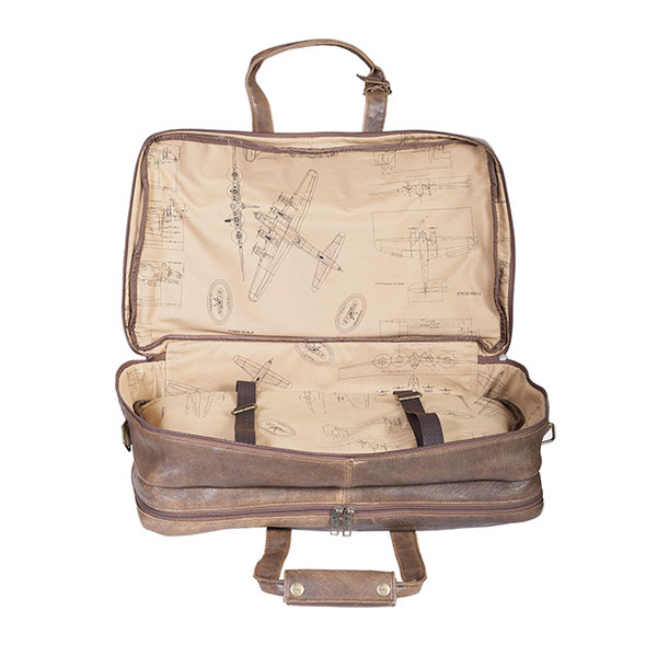 2 Zip Carry-On lambskin duffle bag with Exterior zip pocket. This bag has two roomy center zip compartments. One compartment includes garment straps and the other compartment includes pockets for cell phone and pens. |