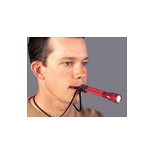 A clever mouthpiece for comfortably holding a flashlight with your teeth. Fits most "AA" or "AAA" size quality aluminum flashlights.