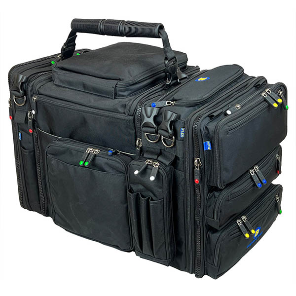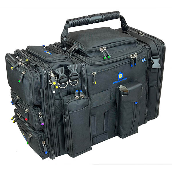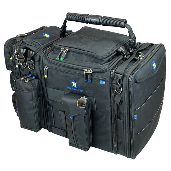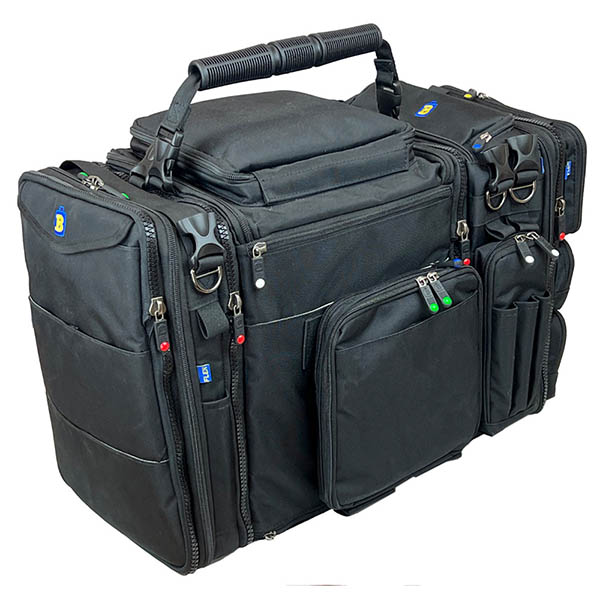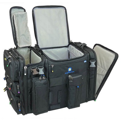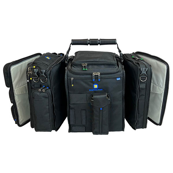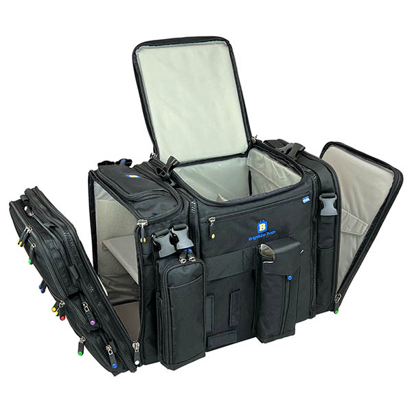 A Flight Bag or Travel Bag that can handle all your gear. Adaptable by adding or removing center sections as needed. Eight different bags can be built with the included modules. Eight bags for the price of one. Designed primarily for aviators who need a Pilot Flight Bag to pack multiple overnight items, such as clothes, shoes, coolers, etc., the B18 HANGAR fits the bill when maximum space is required. Also excellent for those in the Law Enforcement and Emergency Medical field. The CS11 fits all flight helmets. The B18 is 13.5" x 10.5" x 22" with interior storage capacity of 18 inches. (And remember, it is a soft bag so it can expand slightly in every direction.) The B18 HANGAR includes a MAIN HANDLE, and a SHOULDER STRAP. Note that there is no pricing advantage with a preconfigured bag. The total price of a preconfigured bag is exactly the same as adding up the cost of all the included parts. So feel free to add and subtract Parts to customize your bag as you see fit and the pricing will come out exactly the same. The B18 can be secured to the BrightLine Bags Folding Cart (sold separately) by using the zipper on the side of the CS11 and sliding the telescoping handle through the opening. See Gallery photos below. |