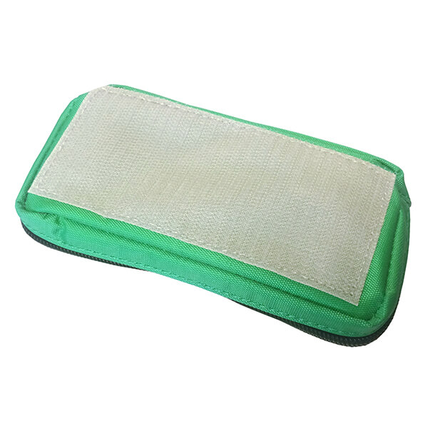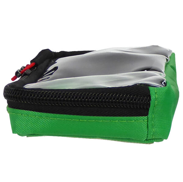 This is the medium-size of the ARRAY pouches. 6 inches long, 3 inches wide, and about 1 inch deep. It has a transparent lid to make it easy to see what's inside. The GREEN color helps you quickly differentiate between your different sized pouches. A zipper with a red cord pull goes around three sides for access. The outside bottom is covered with Hook Velcro which allows you to attach it to the FLEX ARRAY BASE PLATE. |