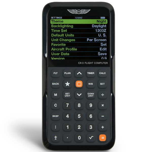 The sleek design, and ergonomic fit and finish of the CX-3 make for easy transport. The removable cover provides protection for the computer when it's not in use and serves as a base for the unit when attached to the back. A no-slip-strip prevents the CX-3 from sliding around on smooth desk surfaces. A Theme feature provides a convenient way to switch from Standard view to Night or Daylight views. The backlighting feature controls the brightness or intensity of the screen, and the buttons on the keypad will light up in Dusk and Night modes for use in darker environments. A Favorite feature provides quick access to your most frequently used function, and aircraft profile memory to save weight and balance information for your specific aircraft.