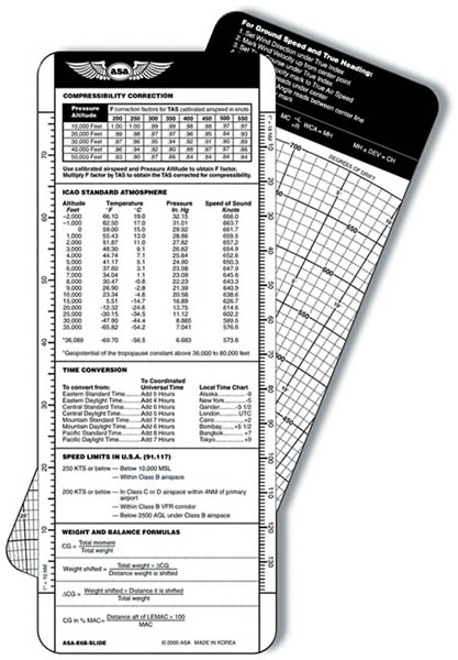 A companion product, this slide picks up where the traditional metal flight computer leaves off (ASA-E6B), providing calculations for the high-speed realm of flight (in the range of 220-700 knots or miles per hour). Pilots simply replace their current slide with this one, which then continues to use the circular computer from traditional E6-Bs. The slide also includes compressibility correction chart, ICAO Standard Atmosphere reference table, worldwide time conversion table, speed limits for the United States, and most frequently-used weight & balance formulas. All of the pertinent formulas & information required for high-altitude, high-speed operations. Meets both FAR & JAR (international) requirements. |