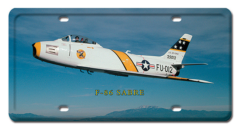 This F-86 Sabre metal license plate measures approximately 6-inches by 12-inches. Unlike most tin signs, we design and make our signs in the United States using 24 gauge American steel and a process known as sublimation, where the image is baked into a powder coating for a durable and long lasting finish. We then perform a vintaging process by hand to give this sign an aged look and feel. The edges of this sign are rounded for extra rigidity and the corners are drilled and riveted for easy hanging.