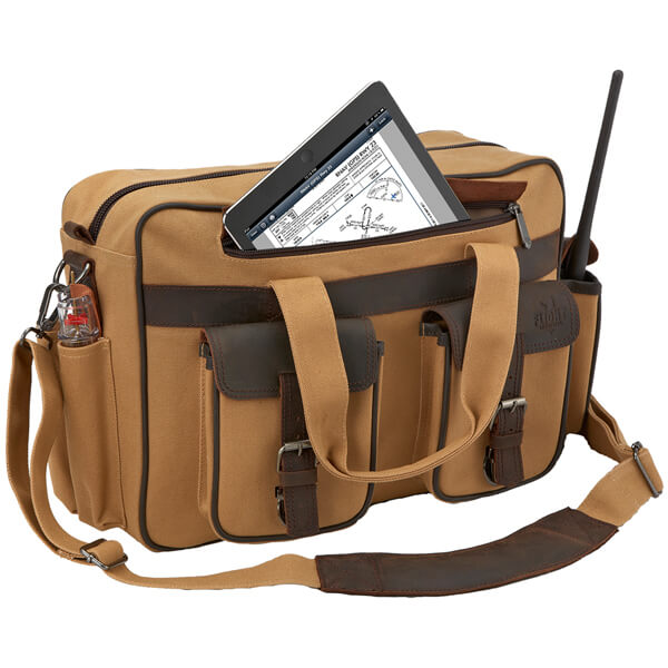 Whether you’re soaring above the clouds in your Cirrus or closing a big deal in your desk chair, this Folio Bag looks like it just left the flight deck of a DC-3. But while the Bush Pilot Folio has plenty of style, it’s also a very practical bag, storing a surprising amount of gear without looking bulky or weighing you down. It has separate pockets for your tablet and laptop, plus a large center compartment and plenty of exterior pockets. You can keep everything separated but easy to find. For further utility, the Folio Bag has a rear strap to securely attach it to your roll-aboard.Features