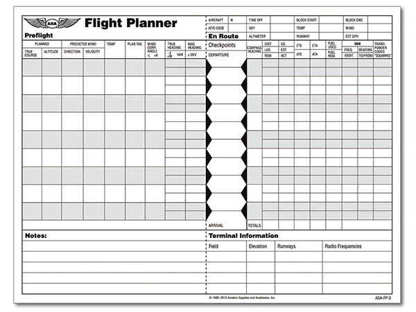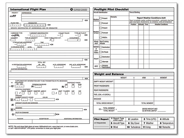 Ideal for both domestic and international preflight planning and in-flight progress tracking. The front side of the flight planner sheets provide for input of preflight information such as planned course, altitude, predicted winds, en route checkpoints, compass headings, estimated times, fuel, navaid frequencies, and terminal information--- field elevation, runway information, and communication frequencies. The backside of the sheets include a preflight pilot checklist, weight and balance computation table, PIREP guidance, and the flight plan format used by the International Civil Aviation Organization (ICAO). On October 1, 2015, the FAA will implement flight plan filing for civil aircraft exclusively under the format used by the ICAO. Flight plans contain specific information relating to the proposed flight of an aircraft and controllers use them to provide air traffic services. Today pilots file flight plans in the U.S. under either the domestic or ICAO format. The use of one format will simplify the process and align U.S. flight plans with ICAO standards. |