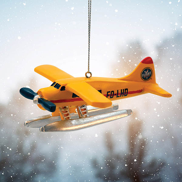 Add a splash to your holiday decorations with the Seaplane Ornament from Flight Outfitters. This custom-made Christmas ornament is ready to land at your home this holiday season. Crafted of a resin/marble mix, the de Havilland DHC-2 Beaver features painted graphics and a matching silver ribbon for easy display. |