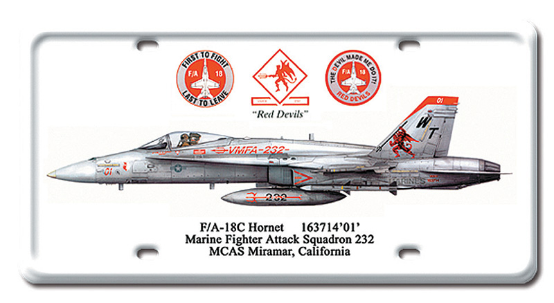 This F/A-18C Hornet metal license plate measures approximately 6-inches by 12-inches. Unlike most tin signs, we design and make our signs in the United States using 24 gauge American steel and a process known as sublimation, where the image is baked into a powder coating for a durable and long lasting finish. We then perform a vintaging process by hand to give this sign an aged look and feel. The edges of this sign are rounded for extra rigidity and the corners are drilled and riveted for easy hanging.