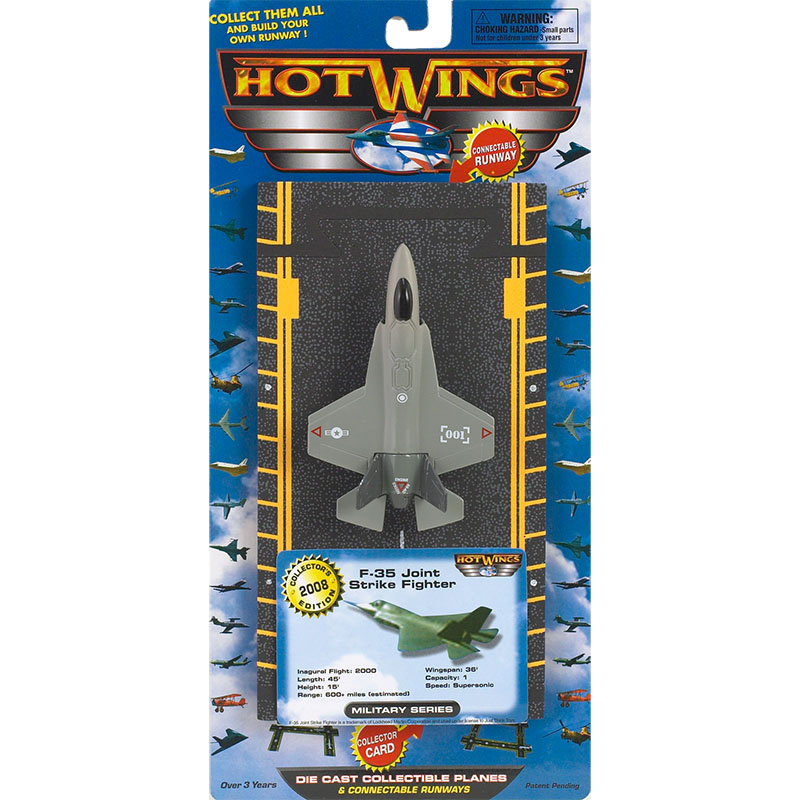 Hot Wings Joint Strike Fighter with connectable runway. Every Hot Wings plane comes with a collector card, plus proprietary connectible runway system that allows collectors to build their own runways and airports. Runways, taxiways and hangar accessories, make Hot Wings the most exciting collectible planes available. Seven distinct series, dating from the earliest Bi Planes to the newest Space Planes, offers something for every aviation enthusiast. Age: Over 3 years due to small parts. |