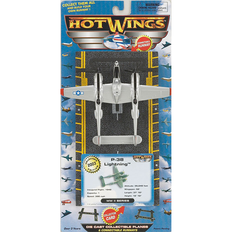 Hot Wings P-38 Lightning with connectable runway. Every Hot Wings plane comes with a collector card, plus proprietary connectible runway system that allows collectors to build their own runways and airports. Runways, taxiways and hangar accessories, make Hot Wings the most exciting collectible planes available. Seven distinct series, dating from the earliest Bi Planes to the newest Space Planes, offers something for every aviation enthusiast. Age: Over 3 years due to small parts. |