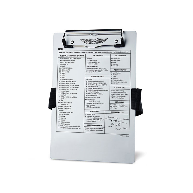 This durable brushed aluminum kneeboard is a great way to organize your flight data providing a strong surface for inflight note taking as well as quick access to important IFR information in the form of a permanent placard.