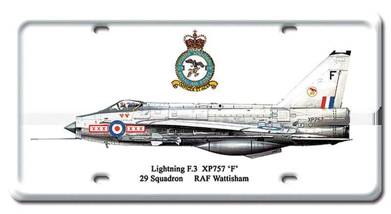 This Lightning F.3 metal license plate measures approximately 6-inches by 12-inches. Unlike most tin signs, we design and make our signs in the United States using 24 gauge American steel and a process known as sublimation, where the image is baked into a powder coating for a durable and long lasting finish. We then perform a vintaging process by hand to give this sign an aged look and feel. The edges of this sign are rounded for extra rigidity and the corners are drilled and riveted for easy hanging.