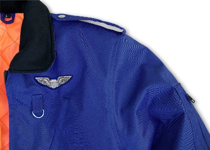 Lightweight Pilot's Jacket with US Wings Patch: combines classic aviator style with contemporary features and modern materials. Features include a 600 Denier Cordura shell (a tightly woven material that provides excellent wind & water resistance), two zippered front handwarmer pockets, two zippered front chest pockets, zippered utility pocket on the left sleeve, velcro-flapped cellphone pocket on the right sleeve, one inside pocket, snap-down epaulets, polar fleece inner collar for comfort & warmth, utility d-ring, reversible high visibility orange lining for extra safety on the ramp or around the aircraft, knit cuffs & waistband, and a nylon front zipper. |