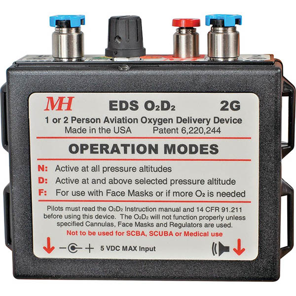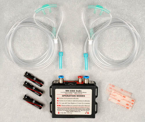 The MH EDS-O2D2 Pulse Demand Oxygen Delivery System is the only single unit, portable, two-place oxygen system currently available for general aviation. A variety of options allow you, the pilot, to customize a system to your specific needs. The O2D2 kit comes with (3) AA batteries, 2 standard cannulas, 2 flare tip cannulas, and 2 face masks all in a handy carry bag.