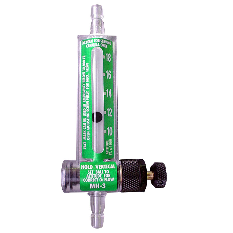 Note: Plastic tip flow meters should only be used with Mountain High systems. All others, like Cirrus, should use the metal tip due to higher output pressures The MH-3 Flowmeter is calibrated for use with the Oxymizer™ cannula for flight up to 18,000 ft. The left (compressed) scale is calibrated for the Oxymizer™ cannula and is limited to flight of 18,000 ft.and below. The right scale is calibrated for a standard cannula or facemask up to 25,000 ft. Note: This Flow Meter has the CPC style fitting, that works with the XCP Constant Flow Systems. |