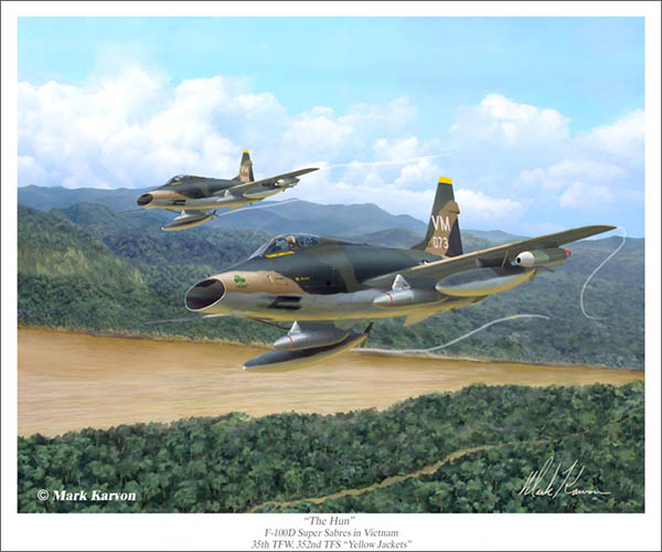 The F-100 Super Sabre was the world's first airplane capable of exceeding the speed of sound in level flight. Known as "The Hun" doe to the F-100 designation, the Super Sabre was the first of the "Century" series of fighters. The aircraft was used extensively during the Vietnam War primarily in the ground attack and forward air control roles. The Super Sabre was eventually phased out of service in Vietnam, superseded by the F-105 Thunderchief and the F-4 Phantom II but they continued in service with Air National Guard units throughout the United States until 1980.