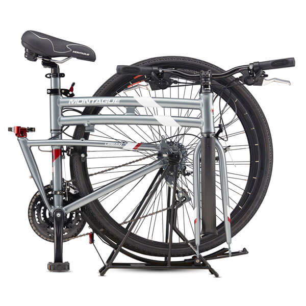 The patented RackStand offers cargo carrying capacity and has a built in fender, acts as a kickstand, and serves as a stand for the folded bike. |