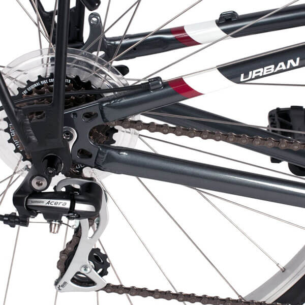 The Urban is a folding bike with standard 700c wheels that delivers road performance on a budget. A 21-speed Shimano drivetrain provides ample gearing for hilly roads while wide 35mm tires cushion the ride over rough terrain and potholes.