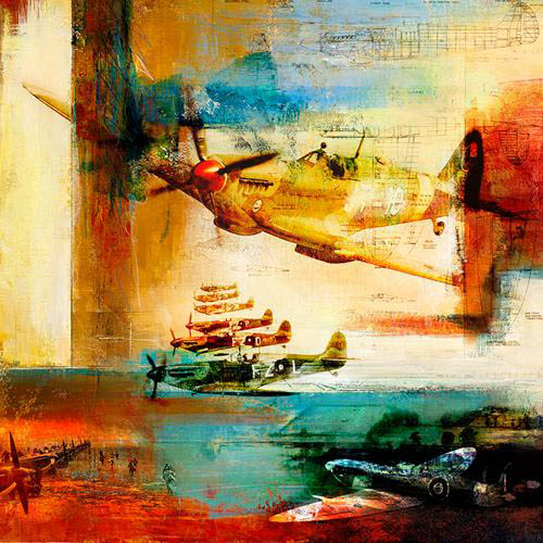 Martin Young Art Supermarine Spitfire print. Artists Frank Martin and Judeen Young, have fused their award-winning techniques to bring you the Martin–Young collection. The multi-layered abstract paintings by Judeen incorporate the collage and graphics of Frank Martin. The process captures the stories of flight with fresh color and vivid imagination. |