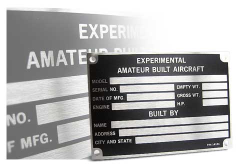 All amateur-built aircraft must have a nameplate. Etch or stamp required data on this indestructible stainless steel nameplate. Conforms to FAA requirements. Size: 3” x 4-1/4”. Attention: Engraving is not included or offered for this nameplate. |