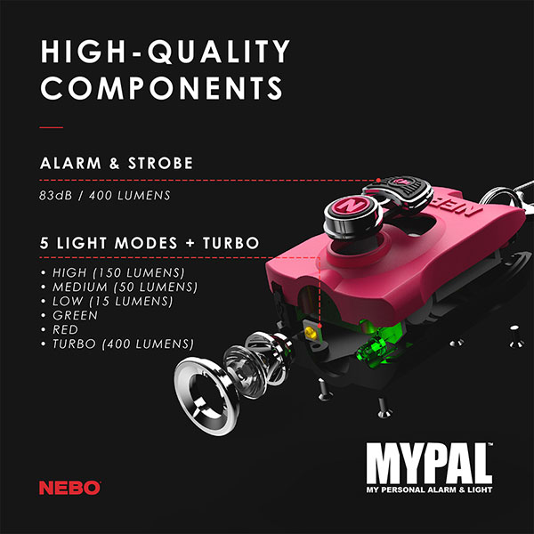 The first NEBO flashlight designed just for women is the MYPAL, a rechargeable personal alarm and light. The various light modes make the MYPAL perfect for any task at hand, and the 400 lumen TURBO mode can light up any space. The MYPAL also features an ear-piercing, 115dB safety alarm and distress strobe to provide safety right at your fingertips. The MYPAL’s compact size fits perfectly in a purse or on a key chain.