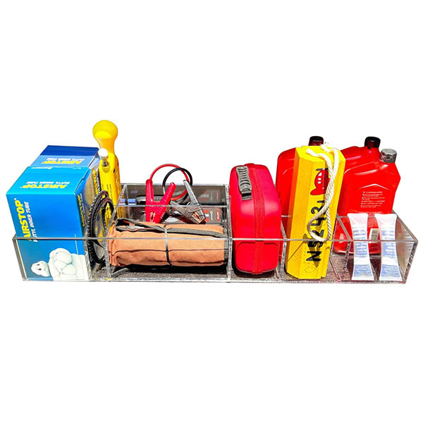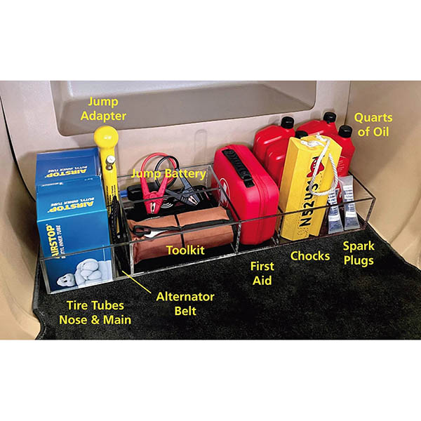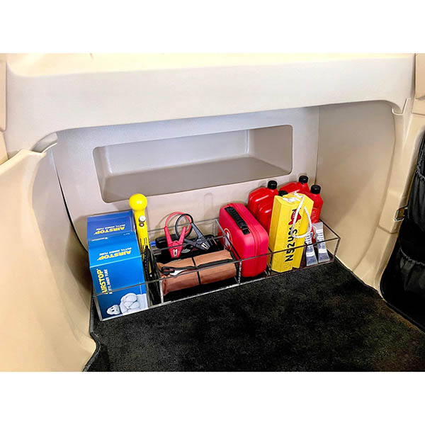 The Baggage Organizer helps pilots keep the critical supplies neat and secure in the back of the aircraft. Supplies can be checked at a glance and everything has a storage place. Store All Your Emergency Aircraft Supplies, so They Are Secure, Organized, and Easily Accessible. The Baggage Organizer has a special storage place for: