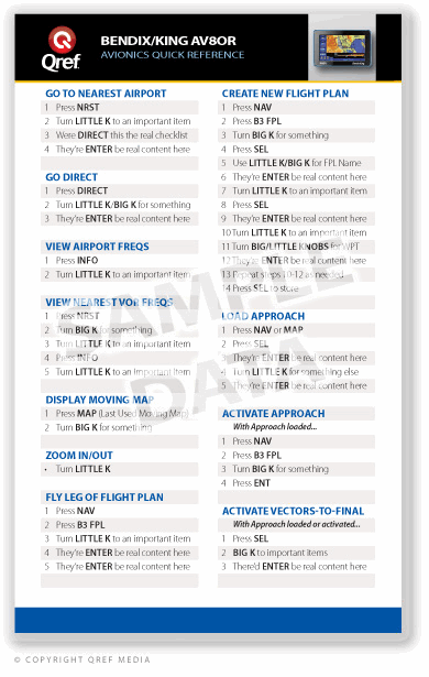 Book vs. Card Now you've got a choice. Our quick reference books feature easy-to-use tabbed pages for concise procedures and navigation help in a compact size, prefect for someone who wants complete information or is new to a system. Our new cards provide all the essential information in a 5" x 8" full-color, hard plastic card for those who are already familiar with their system. Either way, Qref keeps you in the know, quickly and easily. Expert tips, helpful procedure Qref Quick Reference checklists are the first and only procedure checklist dedicated to helping you get the most from your avionics. Our team of experts provide detailed, how-to steps for nearly every feature, and our thoughtful design guides you through each screen, menu, and step. Crushproof Binding Qref checklists are spiral bound at the top for security and easy, smooth page turning. Unlike metal binding, our spiral binding will not crush or let pages slip out. The Perfect Size At 4.5" (114mm) wide and 8" (203mm) tall, Qref checklists are the perfect size for your kneeboard, yoke clip, or gear bag. The large type was designed for maximum readability and clarity while fitting everything you need into a compact checklist. Tabbed Sections Information is organized into standardized sections, and each section is tabbed in sturdy 1/4" (60mm) side tabs, making it easy to navigate to the exact procedure you're after. Indestructible Laminate A industrial-grade 5mil matte laminate protects the front, back, and tabs. Inside pages are laminated with a 1.7mil matte finish that reduces glare and improves readability. Table of Contents and Index The full table of contents inside, and handy index on the back cover, get you to the most commonly used procedures quickly. "You Are Here"™ A unique feature is a special section that intelligently displays all possible screens and how to navigate through them. Never get lost inside your GPS again! Unit Overview See at-a-glance which button does what and discover hidden short cuts and features. |