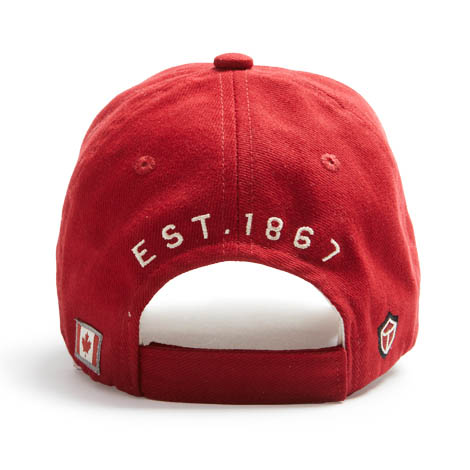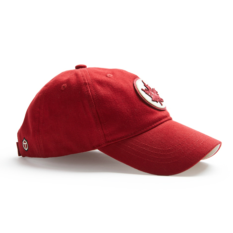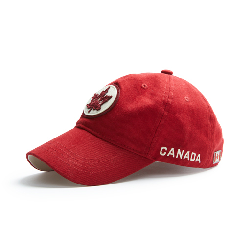 A maple leaf double-layer felt appliqué logo with direct embroidery. Imported. Made of 100% brushed cotton twill. |