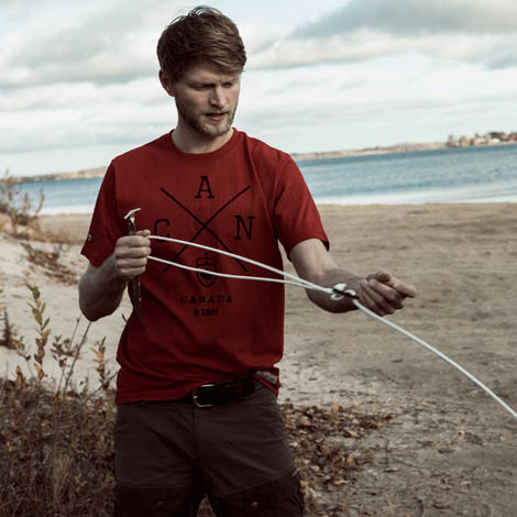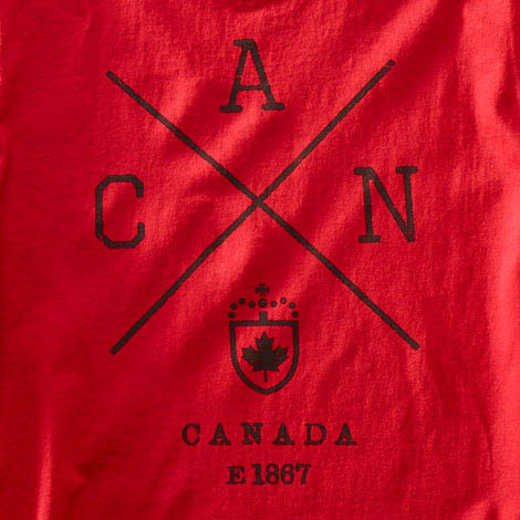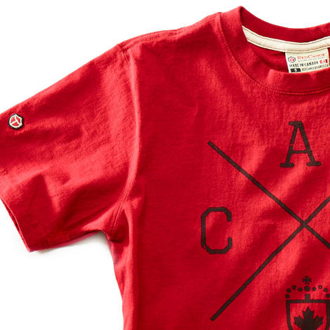 100% cotton T-shirt with inset sleeves and top stitching. Screen printed logo. Red Canoe logo patch on right t-shirt sleeve. Washed after printing to eliminate shrinkage and add vintage appeal. |