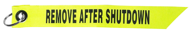 Remove After Shutdown Key Chain. 1" wide, 7-1/2" long yellow polyester fabric with black writing. "Remove After Shutdown" |