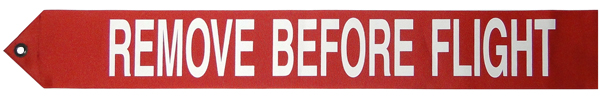 Remove Before Flight Streamer. 3" wide, 22" long red polyester fabric with white writing. "Remove Before Flight" |