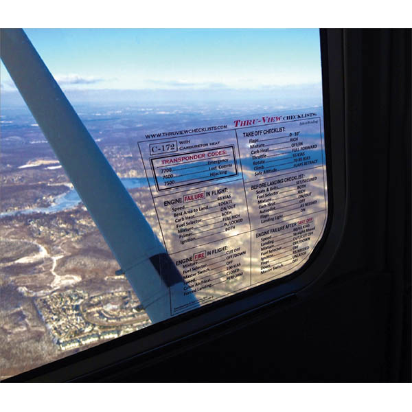 | The Thru-View Emergency Checklist is a heads-up, emergency checklist made of high quality, transparent static cling vinyl that adheres to a window or clear sun visor without the use of adhesive for quick, convenient reference. |