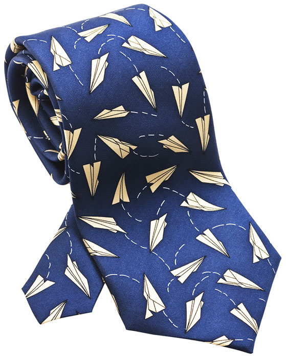 Great in the classroom or the boardroom, this paper airplane silk necktie is the coolest way to loosen up a bit. Dark blue background. |