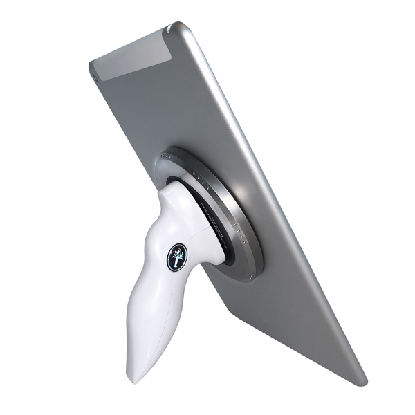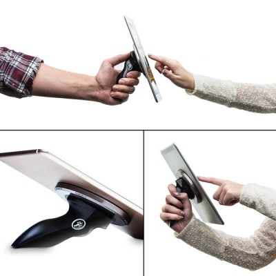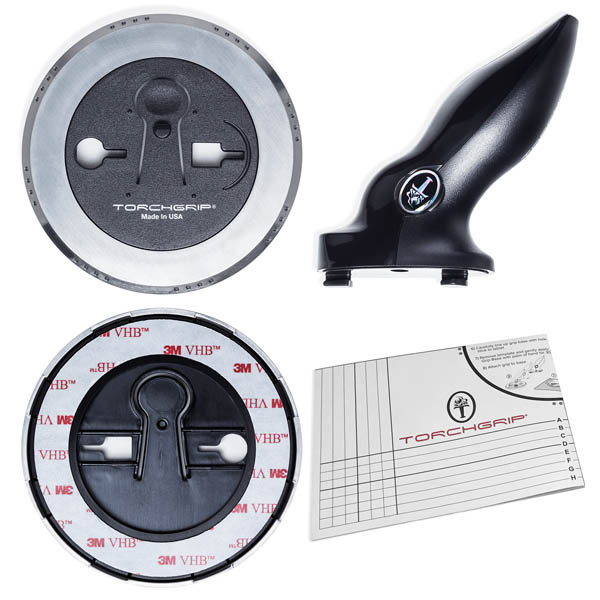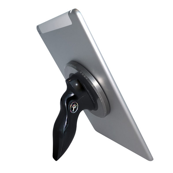 TORCHGRIP® is a patented, made-in-the-USA, universal computer tablet accessory that functions as both a versatile stand and handle providing secure and comfortable handling of your device. Compatible with all iPads and most other tablets. Its durable and stylish design is ergonomically crafted and lightweight. Every time you set down your tablet, TORCHGRIP® is a stand. The handle rotates 360 degrees allowing multiple viewing angles in both portrait and landscape positions. The base of TORCHGRIP® securely attaches directly to the back of your tablet or case (reference “Specifications” for incompatible surfaces) using pre-mounted 3M® VHB™ adhesive which can be removed later to transfer TORCHGRIP® to a new device. The handle detaches by pushing a release button to slide it out of its mounting slots for easy stow and go.