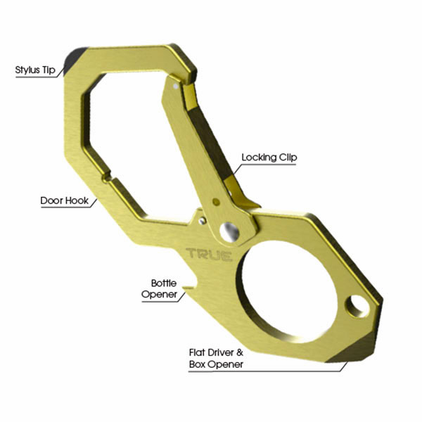 | The No-Touch Carabiner Tool works as an extension of your hand. With this antimicrobial, brass plated took, you can use public touchscreens, keypads, and even open doors and bottles without leaving a fingerprint behind or taking a germ with you. The uniquely designed locking clip remains open to ensure it will never get stuck on any door handle. This multi-functional Carabiner Tool also includes a built-in box opener, flat head driver, bottle opener, and a stylus tip for touchscreen devices. Now you can do it all without touching a thing. |