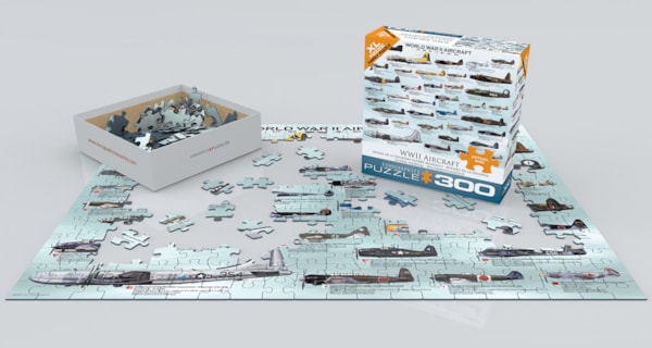 This unique jigsaw puzzle features aircraft of both the Allied and Axis forces, including many of the greatest warplanes such as the Hurricane, the Supermarine Spitfire, the Messerschmitt BF-109 and the Boeing B-29 SuperFortress. |