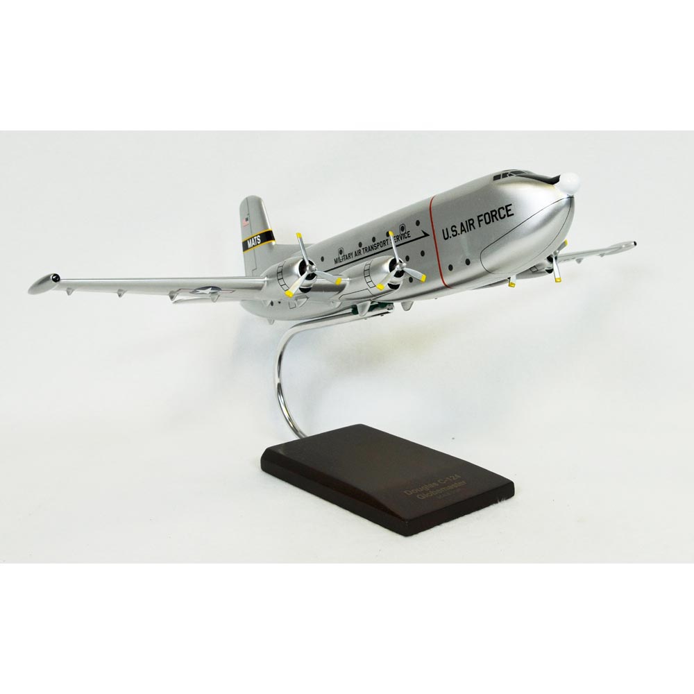 The Douglas C-124 Globemaster II, also known as ""Old Shakey"", was a heavy-lift cargo military aircraft manufactured by the Douglas Aircraft Company in Long Beach, California. C-124s provided heavy airlift during the Korean War, Southeast Asia War and other important airlifts such as re-supply missions to Antarctica, refugee evacuation in the Congo and mercy flights to Morocco, Chile and elsewhere throughout the world following floods and other natural disasters. It could lift 33.560 kilograms (74,000 pounds) of cargo. Its double-decked cabin could also be fitted with 200 seats for troops, or with 123 litters for casualty evacuation. Flight crew was six. The C-124 first flew on November 27, 1949. This C-124C variant of Globemaster was manufactured by Douglas Aircraft Corporation at Long Beach, California, and delivered to the U.S. Air Force on May 4, 1955. The aircraft was assigned to the 15th Air Transport Squadron (Heavy) of the Military Air Transport Service (MATS) operating out of Dover AFB, Delaware. The C-124C featured uprated engines, an APS-42 weather radar with a distinctive nose ""thimble"" radome, and wingtip-mounted combustion heaters to provide cabin heating and wing de-icing. The radar and combustion heaters were retrofitted to most C-124As. At the types peak in 1963, there were 377 C-124s in service with 20 transport squadrons. A total of 243 C-124C were built. |