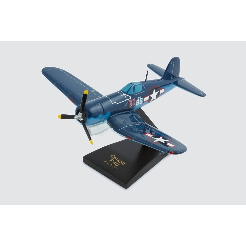 This collectable model Navy F4U-1 Corsair represents one of the pinnacles of piston-engine fighter development, an aircraft that saw service in two wars. Painted as it appeared in Navy service, this model Corsair is painstakingly built from Philippine mahogany by skilled craftsmen using a wealth of detail. This 1/48-scale model F4U-1 Corsair makes a great pilot gift, or a present for any veteran, aviation enthusiast or history buff. The Corsair was one of the great fighter-bombers of World War II and Korea, and remained in production longer than any other piston-engine fighter in U.S. history. Its distinctive inverted gull-wing profile and long nose made it one of the most distinctive piston aircraft ever built, and able to reach speed approaching 450 mph, one of the fastest. Development of the Corsair began in 1938, with the first flight of the XF4U-1 on May 29, 1940. It used the largest piston-engine available at the time, the 18-cylinder, 2,000-horsepower Double Wasp radial coupled to a 13-foot diameter propeller. The distinctive wing design came about from the need for long underwing struts to allow clearance for the large prop. Armed with six .50-caliber machine guns and able to carry rockets or 2,000 pounds of bombs, the Corsair was a formidable weapons system. However, the Corsair faced a number of teething problems that slowed its introduction to the fleet. Its long nose presented visibility problems on landing, and the inverted gull-wing presented problems in spin recovery. Marine squadrons, not as concerned about carrier suitability, took to the powerful fighter. By 1944, the Corsair had once again been introduced to carrier service. Corsairs were flown by the famous ""Black Sheep"" Squadron (VMF-214, led by Marine Maj. Gregory ""Pappy"" Boyington) in an area of the Solomon Islands called ""The Slot"". Boyington was credited with 22 kills in F4Us (of 28 total, including six in a Flying Tigers P-40 Warhawk). VF-17, the Jolly Rogers, also flew Corsairs. On Nov. 11, 1943, Lt. Ira Kepford, during a strike at Rabaul, shot down four enemy aircraft, winning a Navy Cross for his exploits. By February 1944, Kepford was the Navys leading ace, with 16 victories. In his five months of combat duty, Kepford earned two Navy Crosses, the Gold Star, the Silver Star, three Distinguished Flying Crosses, the Air Medal, Unit Commendation to VF-17, and the American Defense Service Medal. In Korea, the Corsair served as a fighter-bomber, including as a night fighter. Corsairs served in the air forces of many nations, and flew its last combat sortie in 1969, in the Football War of 1969 between Honduras and El Salvador. |