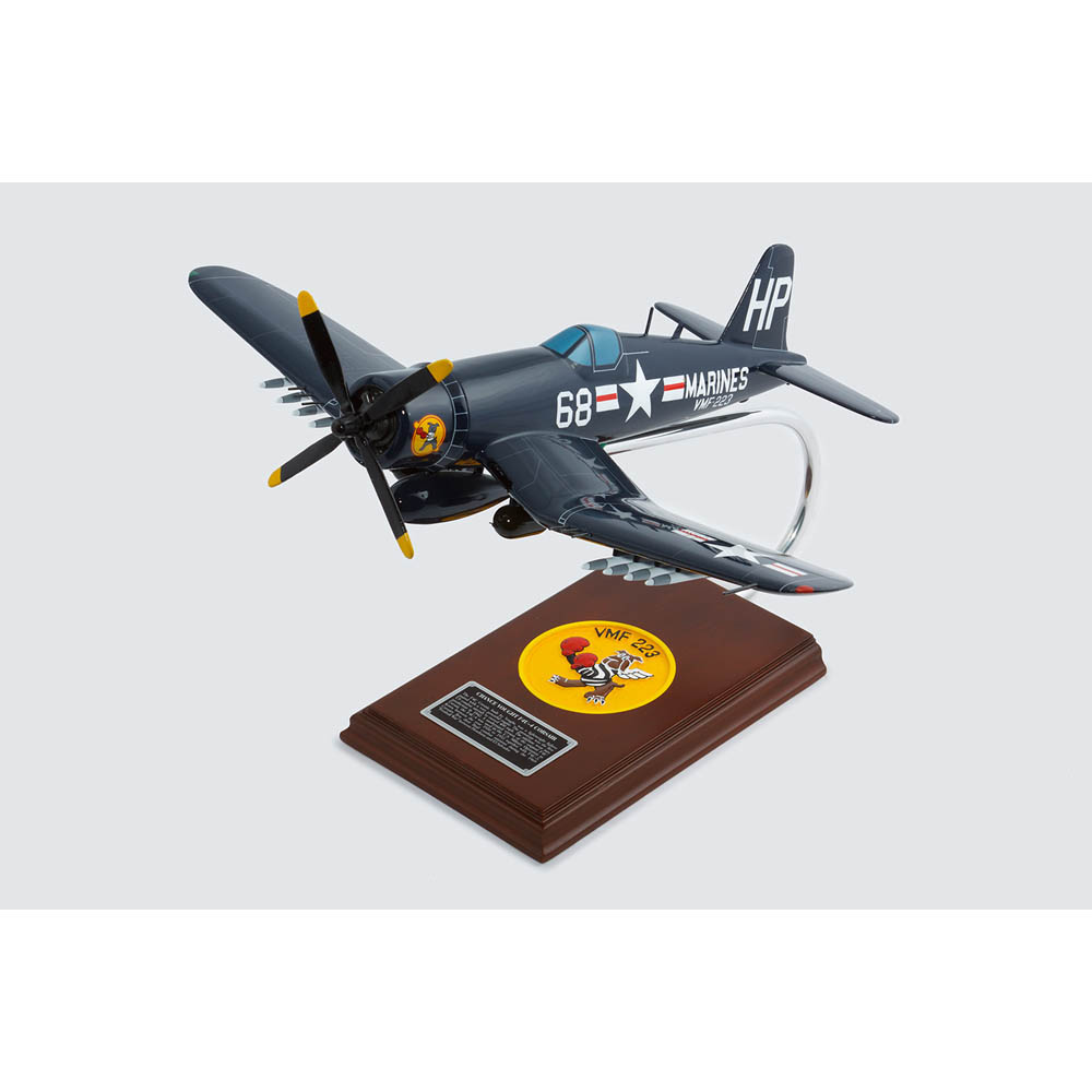 The F4U Corsair was the result of a 1938 United States Navy (USN) requirement for a new carrier aircraft that could match the performance of the best land and carrier-based fighter planes. Designed by Rex Buren Beisel and manufactured by Chance Vought, it was made to carry the most powerful engine and largest diameter propeller ever built at that time. Although designed as a carrier fighter for the USN, concerns about its landing and visibility characteristics led it to be used initially by the United States Marine Corps (USMC), which operated on land-based runways. In March 1943, the Marines introduced the aircraft to its debut combat. Eventually it was put into service with the USN in January 1944, after the British proved that it was able to operate safely from carriers. The plane was not slow to prove its fighting ability and succeeded in gunning down 2,140 enemy aircraft while losing only 189 F4Us during World War II. Consequently, 24 Corsair pilots became air aces. The Corsair was given the nicknames “The Sweetheart of the Marianas” and “The Angel of Okinawa” by allied ground forces. The Japanese troops dubbed it “Whistling Death” because of the sound that it made during dive-bombing or strafing runs. The F4U-4 was the last variant to be produced during World War II, entering service just four months before the end of hostilities. With a rate-of-climb of nearly 4,000 feet per minute and a service ceiling of 41,500 feet, it was the Navy’s answer to the much improved Japanese fighters that were arriving in the Pacific. In addition to a new propeller, the F4U-4 had a completely redesigned cockpit, a new canopy for improved bubble effect, a new armor-plated bucket seat, and regrouped instruments. Improved fighter-bomber capabilities were made possible by putting rocket stations on the outer wing panels. The F4U-4 saw combat in Korea between 1950 and 1953. |