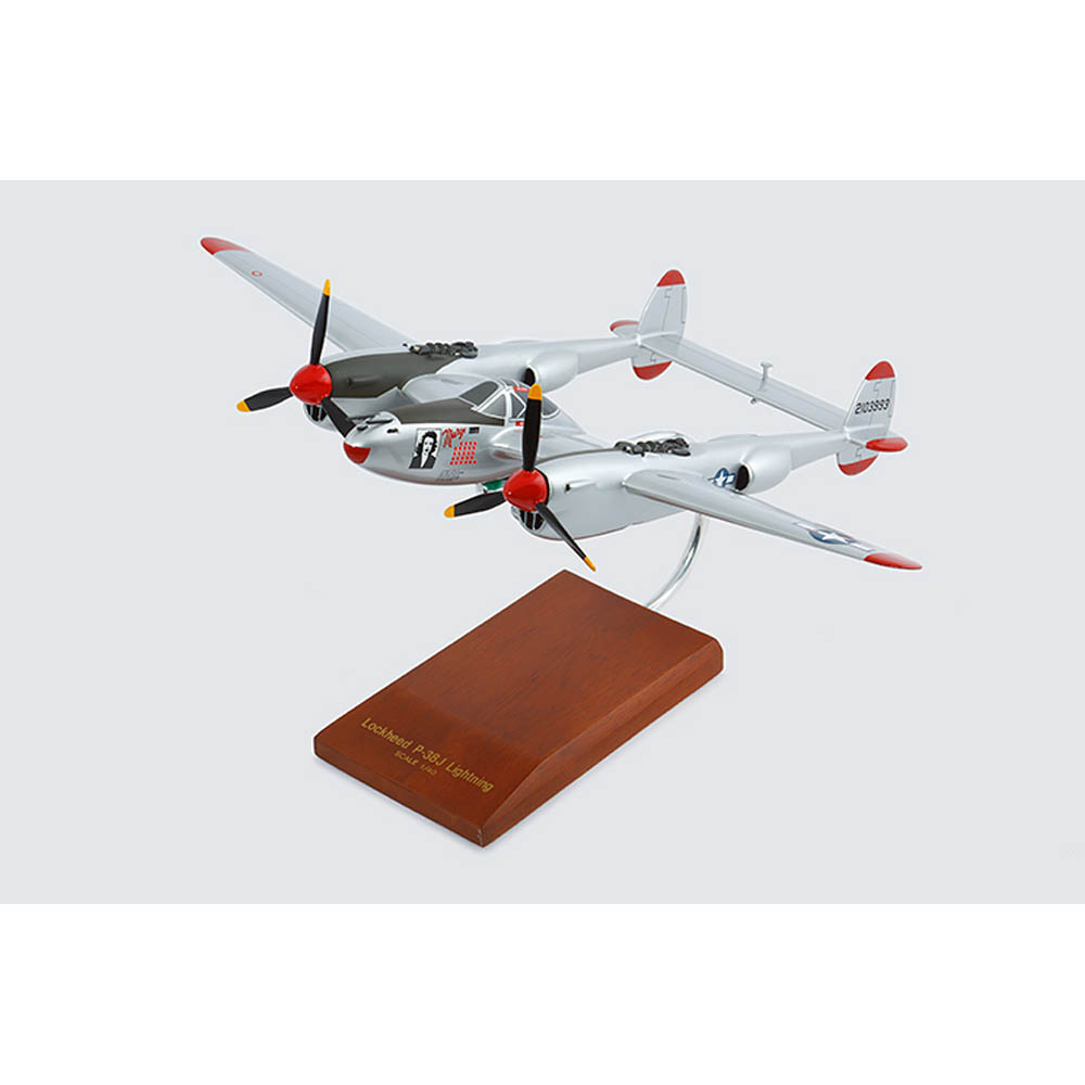 The Lockheed P-38 Lightning was an American fighter aircraft used by the US Air Force during the World War II. Developed to a United States Army Air Corps requirement, the P-38 had distinctive twin booms and a single, central nacelle containing the pilot and armament. The aircraft was used in a number of different roles, including dive bombing, level bombing, ground strafing, photo reconnaissance missions, and extensively as a long-range escort fighter when equipped with droppable fuel tanks under its wings. Designed by Engineer Clarence “Kelly” Johnson, the P-38 Lightning flew for the first time on January 27 1939. The P-38J was the fastest variant of the entire Lightning series--420 mph at 26,500 feet. Maximum speed at 5000 feet was 369 mph, 390 mph at 15,000 feet. Range was 475 miles at 339 mph at 25,000 feet, 800 miles at 285 mph at 10,000 feet, and 1175 miles at 195 mph at 10,000 feet. Maximum range was 2260 miles at 186 mph at 10,000 feet with two 250 Imp gall drop tanks. An altitude of 5000 feet could be attained in 2 minutes, 15,000 feet in 5 minutes, 10,000 feet in 7 minutes. Service ceiling was 44,000 feet. Weights were 12,780 lbs empty, 17,500 lbs normal loaded, 21,600 lbs maximum. Wingspan was 52 feet 0 inches, length was 37 feet 10 inches, and height was 9 feet 10 inches. Wing area was 327.5 square feet. Armament consisted of one 20-mm Hispano M2(C) cannon with 150 rounds plus four 0.50-inch Colt-Browning MG 53-2 machine guns with 500 rounds per gun. In addition two 500, 1000, or 1600-lb bombs or ten five-inch rockets could be carried on underwing racks. |