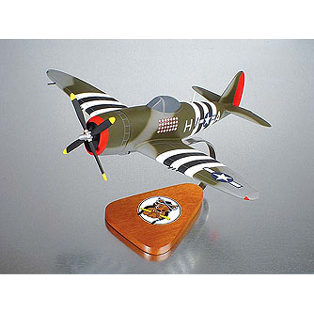This collectable model P-47D Thunderbolt represents the “Jug” – a tough fighter that began the air war in Europe as a bomber escort and later became the primary fighter-bomber of the theater. This 1/32-scale model P-47D Thunderbolt makes a great pilot gift or a present for any veteran, aviation enthusiast or history buff. The P-47 Thunderbolt was one of the largest single-engine fighters of the war, an airframe built around a powerful R-2800 radial engine of 2,500 horsepower. Armed with eight .50-caliber machine guns and able to carry up to 2,500 pounds of bombs or 10 5-inch rockets, the Thunderbolt was fast, tough and effective. Service deliveries of the P-47 began in 1942, with its first combat mission on March 10, 1943. The Thunderbolt found air-to-air success, with tactics that took advantage of its ability to dive, then zoom-climb to regain energy. The P-47 shot down more than 3,700 enemy aircraft, then struck fear into Wehrmach formations as the ground war in Europe began again in 1944. Its ability to deliver bombs or rockets, as well as being a potent strafing platform severely hindered the movement of German units. The P-47 served briefly with the Strategic Air Command following World War II. A number of P-47 remain flyable, and can often be seen and exhibits and air shows. |