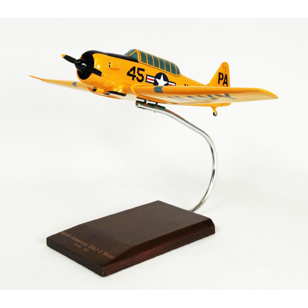 The T-6 Texan is a single-engine advanced trainer aircraft used to train fighter pilots of the United States Army Air Forces, United States Navy, Royal Air Force and other air forces of the British Commonwealth during World War II. The T-6 is known by a variety of designations depending on the model and operating air force such as the ""AT-6"", the ""SNJ"" and ""Harvard"". The T-6 originates from the North American NA-16 prototype which was first sloen on April 1, 1935. The T-6 originated from the American NA-16 prototype which was modified as the NA-26 and entered USAC ""Basic Combat"" aircraft competition in March 1937. Production of the first model began and there were 180 supplied to the USAAC as the BC-1 and 400 to the RAF as the Harvard I. The US Navy received 16 modified aircraft, designated as the SNJ-1, and the 61 as the SNJ-2 with a different engine. The AT-6, which was equivalent to the BC-1A was designated as the Harvard II for RAF/RCAF orders and 1,173 were supplied by purchase or Lend Lease, mostly operating in Canada. Next comes the AT-6A, based on the NA-77 design powered by Pratt & Whitney R-1340-49 Wasp radial engine. The USAAF received 1,549 and the US Navy 270 (as the SNJ-3). It has a maximum speed of 208 mph at 5,000 ft and a range of 730 miles. The Texans were put into service during the Korean War and the Vietnam War. Texans had also been a regular participant in air shows and was used in many movies. |