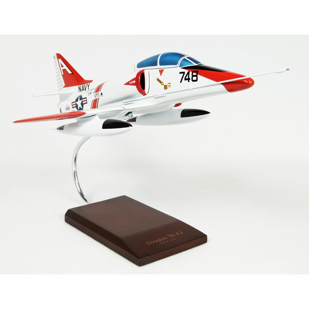 This high quality replica is handcrafted from mahogany and comes with a wooden base. Length is 18" and wingspan is 10-1/2". Scale is 1/32. The TA-4J Skyhawk is a two-seat, lightweight, high performance aircraft with a modified delta wing manufactured by the Douglas Aircraft Company of Long Beach, CA. The TA-4Js maiden flight was on December 17, 1968 and first entered service in the mid-1969. TA-4J deliveries were supplemented by conversion of numerous TA-4Fs to the ""J"" designation through removal of ordnance system components. In 1968, a contract was let to produce the TA-4J, a trainer version of the TA-4F. The TA-4J Skyhawk differed from the TA-4F through the removal of tactical weapons system and aerial tanker components and the installation of the J52-P6 engien instead of the higher rated engine J52-P8. The TA-4J is primarily used for training and various other contract duties such as Electronic Warfare, Adversary and Threat Simulation. A total of 277 TA-4Js were built. |