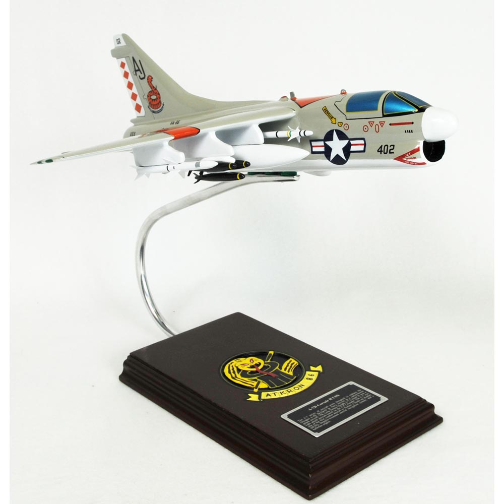 The A-7 Corsair II is a carrier-based subsonic light attack aircraft and was one of the first combat aircraft produced by Chance Vought. The A-7 was one of the first combat aircraft featuring a head-up display (HUD), doppler-bounded inertial navigation system and a turbofan engine. The A-7 first entered service with the US Navy during the Vietnam conflict and was then adopted by the United States Air Force. The A-7 Corsair II was nicknamed as ""SLUF"" (Short Little Ugly Feller) by pilots. The A-7s were used as a deception aircraft by the group between 1981 and 1989. The A-7B has a general ease of flying and excellent forward visibility but lacks in engine thrust. The A-7B incorporates a TF30-P-8 engine with 12,190 lbf of thrust. An A-7 donated from the National Museum of Naval Aviation at Pensacola Florida is located on the side of the road just outside Lake City, Florida. An A-7 can also be found at at Akron-Canton airport hangar at MAPS air museum in Akron, Ohio. There is also one mounted at the Atlanta Road side of Naval Air Station Atlanta in Marietta, Georgia. Another A-7 is on display at Tillamook Air Museum and another A-7 is located behind a fence in the parking lot of the Evergreen Aviation Museum in McMinnville, Oregon. There were many A-7s which survived. In 1971, A-7Bs which survived were further upgraded to TF30-P-408 with 13,390 lbf of thrust and there were 196 A-7Bs built. |