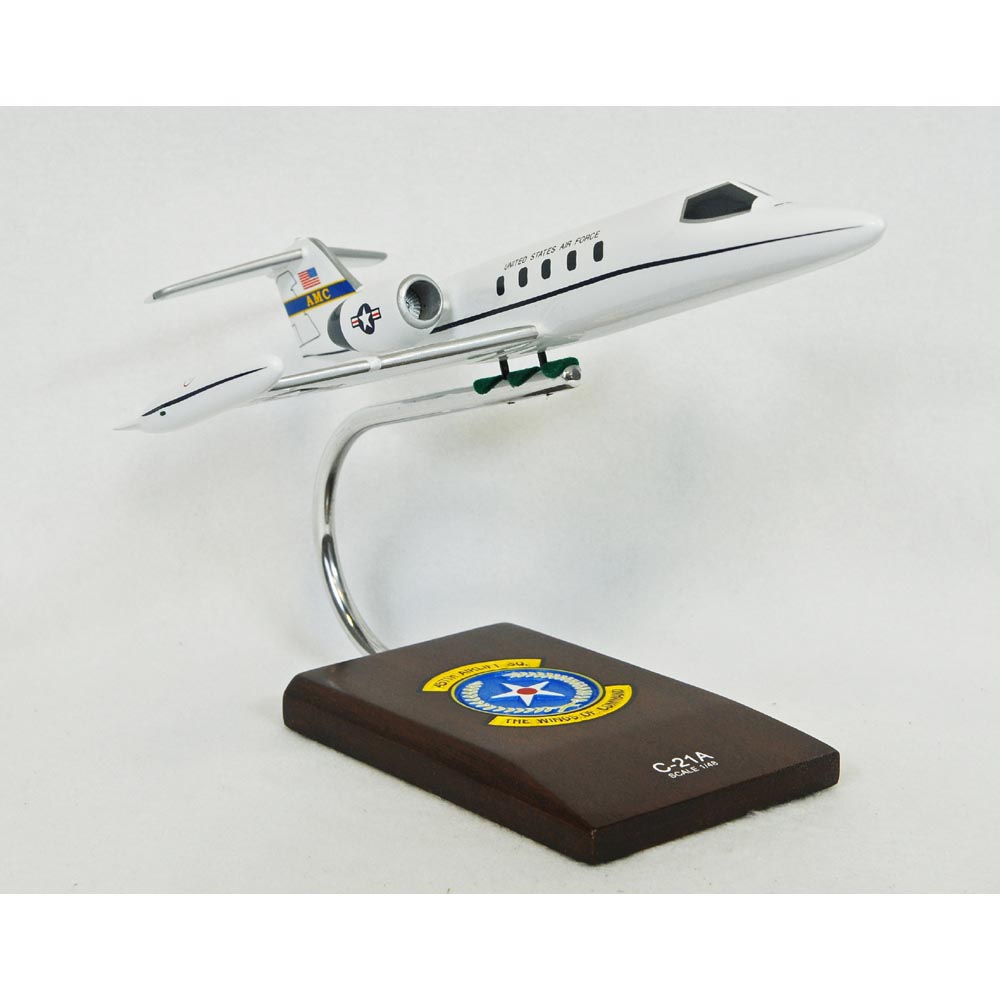 The C-21A is a military variant of the Learjet 35A business jet. It is a twin turbofan engine aircraft for cargo and passenger airlift and is also capable of transporting litters during medical evacuations. In April 1984, the delivery of the C-21A fleet began and was completed in October 1985 for deployment. On April 1, 1997, all continental US-based C-21s were realigned under Air Mobility Command, with the 375th Airlift Wing at Scott Air Force Base, Ill. as the lead command. C-21s stationed outside the continental United States are assigned to theater commanders. The C-21A has a maximum speed of 530 mph and a maximum range of 2,306 miles. It has a crew of two, a pilot and a co-pilot. The C-21A has a capacity of carrying eight passengers. The aircraft is equipped with an automatic navigation system and four cathode ray tubes display for enhanced pilot crew efficiency. There are 38 C-21As in active duty with the Air Force. |