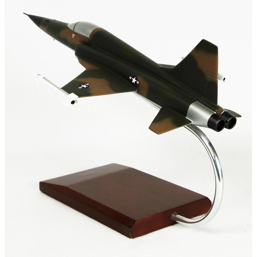 The F-5E Tiger II is a single-seat version for the Tunisian Air Force. In 1950, the F-5 started its life as a privately-funded light fighter program by Northrop. The first generation F-5A Freedom Fighter entered service in 1960. During the Cold War, there were over 800 produced through 1972 for US Allies. The F-5 proved to be a successful combat aircraft for US Allies, but it didnt entered front-line service with the US due to diverging priorities of the US services. A few surplus F-5As and F-5Es have been sold to private owners. In 1970, Northrops F-5A-21, which subsequently became the F-5E, was designated to replace the F-5A. It was lengthened and enlarged, with increased wing area and more sophisticated avionics, and was initially having an Emerson AN/APQ-153 radar. The F-5E eventually acquired its official name Tiger II. In its service life, the F-5E experienced numerous upgrades. The F-5E Tiger II has a crew capacity of 1. It has a maximum speed of 917 kn and a ferry range of 2,010 nmi. The F-5E Tiger II production amounted to 1,400 including all versions and production ended in 1987. Various F-5 versions remain in service with many other nations. Singapore has approximately 49 modernized and re-designated F-5S and F-5T aircraft. The F-5 was also developed into a reconnaissance version, the RF-5 Tigereye. |